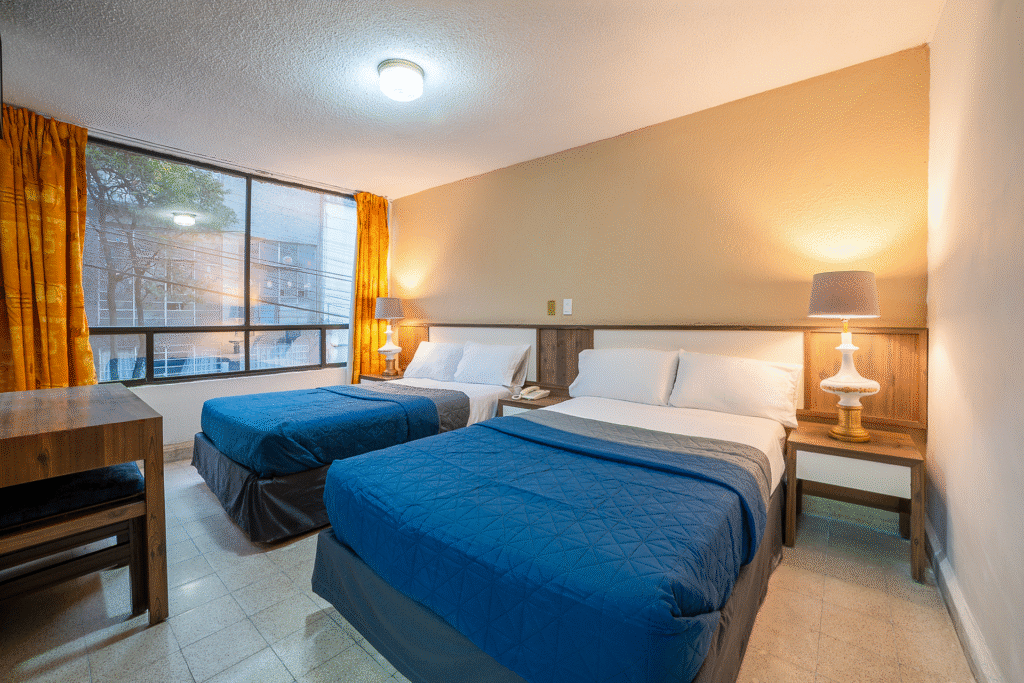 Una opción práctica para descansar. Esta habitación cuenta con dos camas matrimoniales, clóset, caja de seguridad, WiFi, TV por cable, escritorio y baño privado. Ideal para quienes viajan solos y buscan lo básico para una buena noche de descanso.